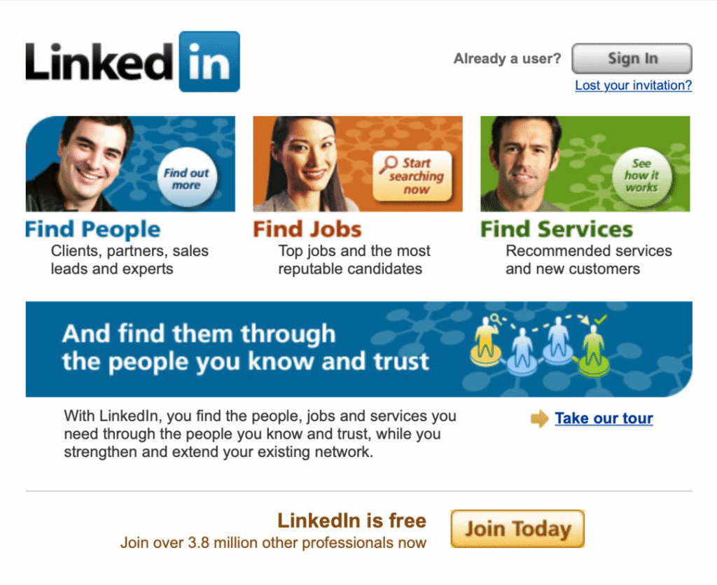 LinkedIn launched its MVP in May 2003 with just a couple of basic features: user profiles and a simple search function. In the early days, you could only connect with someone if you knew their email address — a feature that still exists today. The site’s design was far from perfect, but it was enough to test whether professionals were interested in an online networking platform.