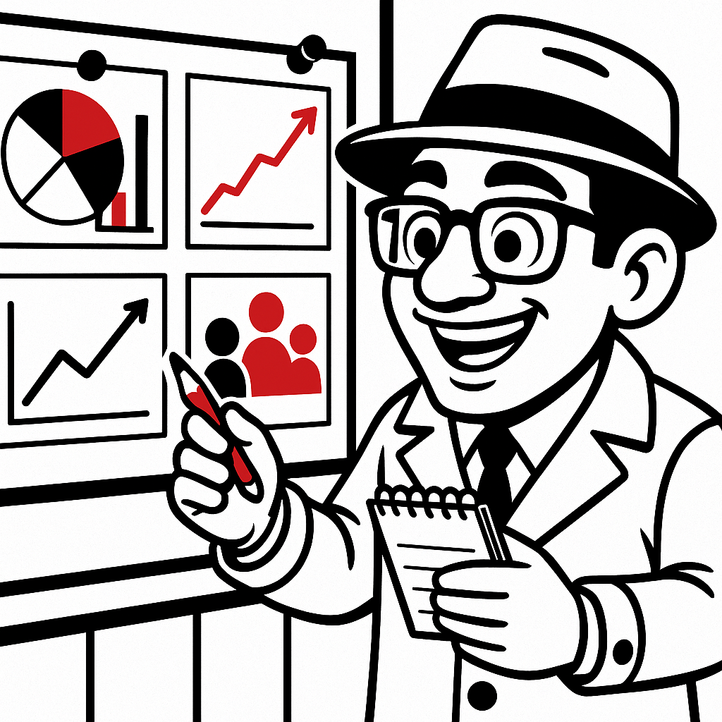 (Detective diving into research and trends)