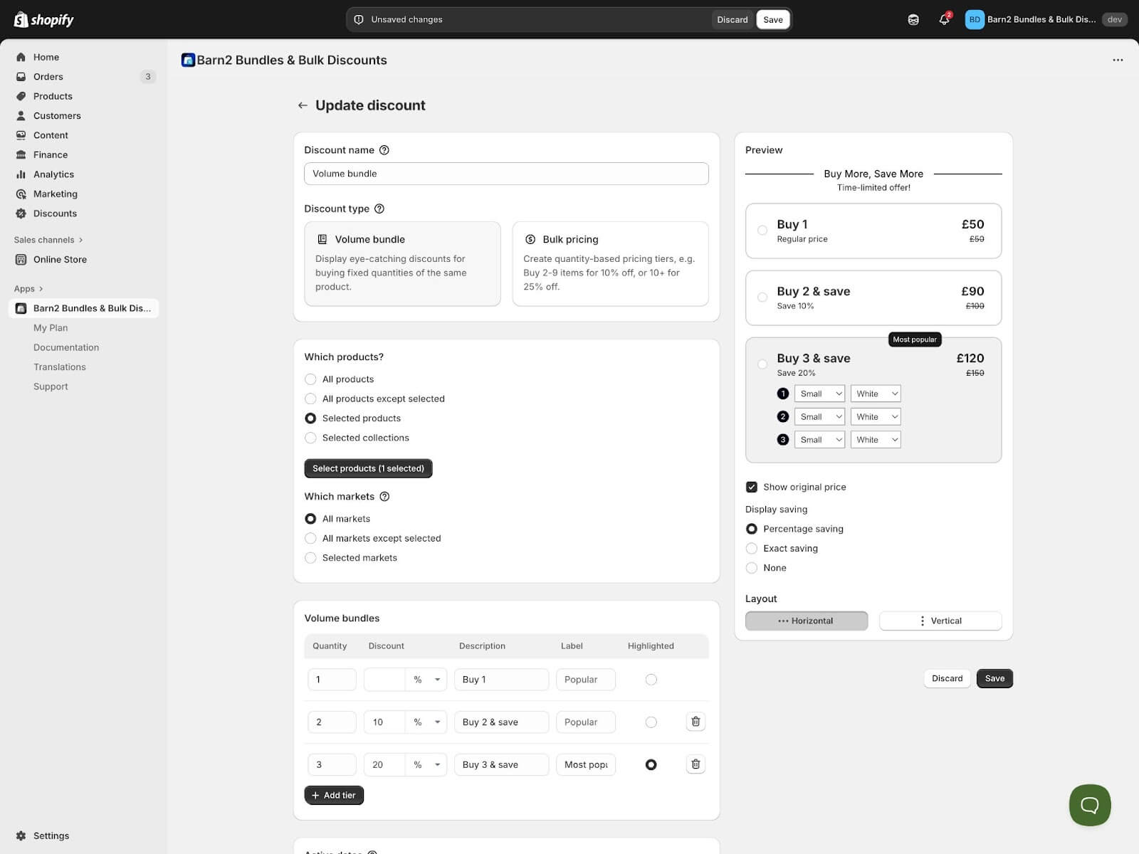 Now that you understand the pricing psychology, letโs implement these principles using Barn2 Bundles & Bulk Discounts. This Shopify bulk discount app offers two distinct approaches, each suited to different psychological strategies.